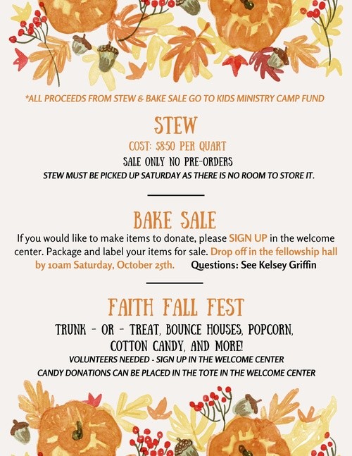 - Attend our many Events throughout the year. (Spring Fling-Family Conference-Harvest Fest-VBS-etc...)